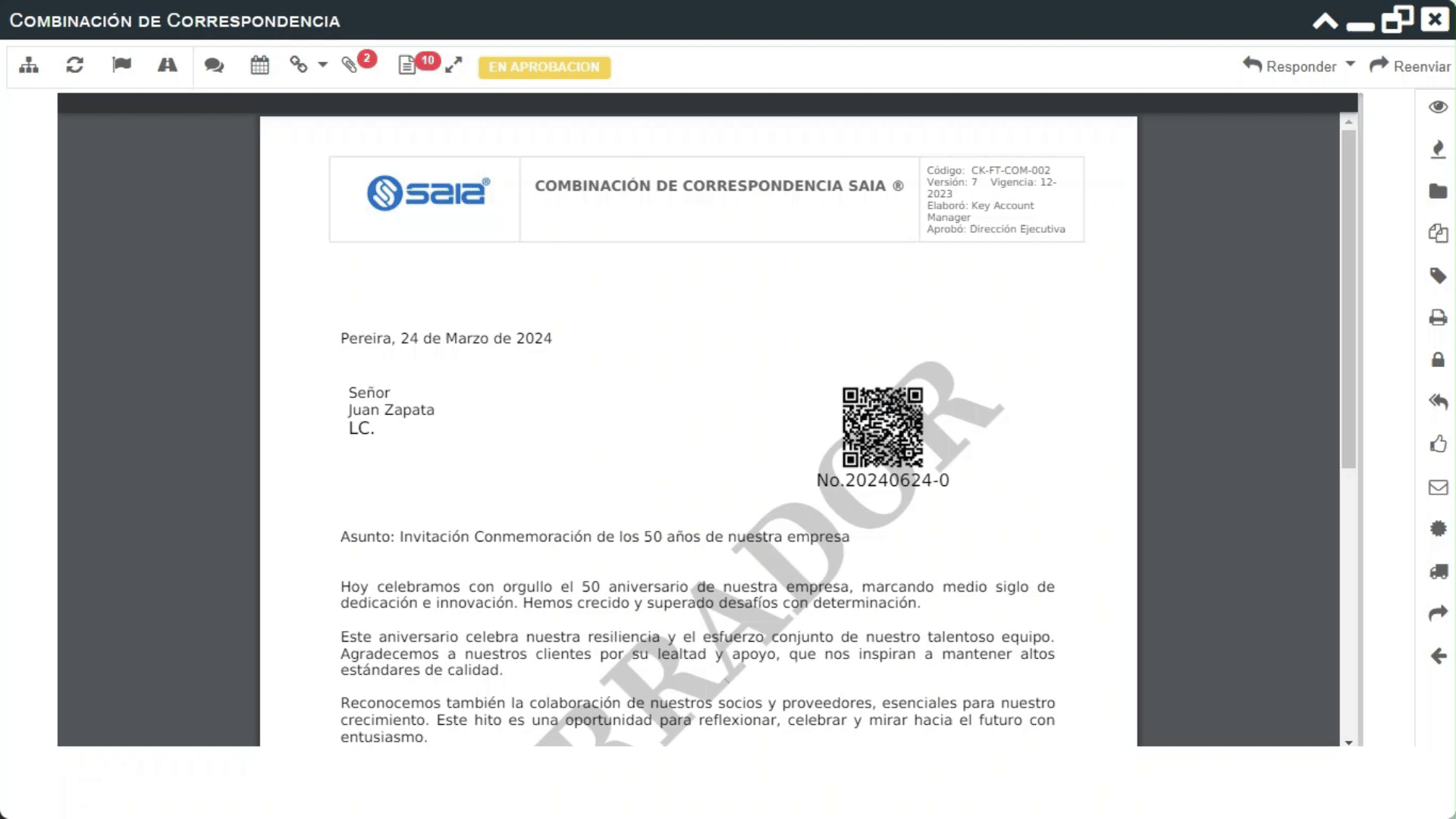 «Margarita, necesita enviar 130 invitaciones a sus colaboradores para informar sobre un evento por la conmemoración de los 50 años de aniversario de su empresa, desde SAIA® puede acceder a la combinación de correspondencia y generar los documentos rápidamente para enviarlos vía correo electrónico, lo único que debe hacer es ingresar los datos del destinatario y automáticamente se genera el paquete de documentos aprobados y enviados«.
